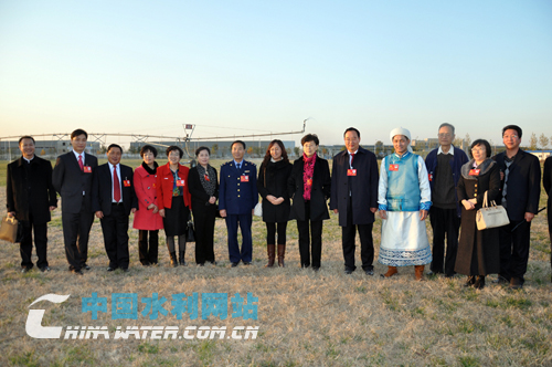 十八大代表們在“大禹銀帆”噴灌機前合影留念