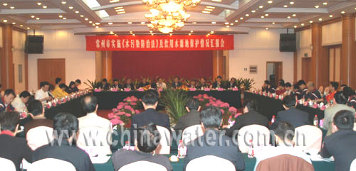 5月14日上午,記者團一行聽取了常州市政府實施《水污染防治法》和飲用水源地保護情況介紹。全國人大環(huán)資委副主任委員葉如棠聽取匯報并講話。常州市委書記范燕青到會致辭。當天下午,記者團考察了該市在建的江邊污水處理廠以及魏村自來水廠。