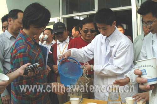記者們?cè)谕┼l(xiāng)水廠采訪(王凱攝)