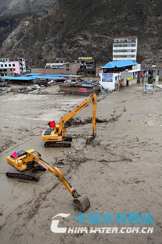 瓦廠橋泄流口,施工機械正將上游泥石挖送到下游