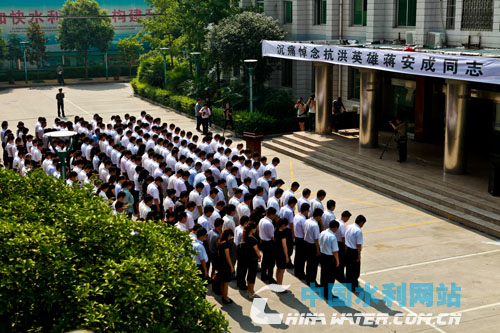 中國(guó)水利網(wǎng)站西安訊(記者 王辛石)7月5日上午9時(shí)30分,陜西省水利廳機(jī)關(guān)大院內(nèi)人群肅立,氣氛凝重。在“沉痛悼念抗洪英雄蔣安成同志”白底黑字橫幅下,陜西省水利廳300多名機(jī)關(guān)干部在廳長(zhǎng)王鋒帶領(lǐng)下,集體為在抗洪一線因公殉職的南鄭縣水利局長(zhǎng)蔣安成默哀三分鐘。與此同時(shí),陜西省水利廳廳直系統(tǒng)19個(gè)單位和5個(gè)重點(diǎn)工程建設(shè)工地1萬(wàn)余名干部職工也分別進(jìn)行了集體默哀儀式,共同悼念蔣安成同志。