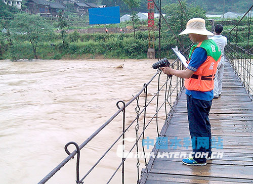 洪水咆哮,水流湍急,應(yīng)急監(jiān)測隊隊員始終堅持用雷達槍在吊橋上搶測洪峰,之后又打下比降樁以保證洪水過后能準確推算洪峰流量,并及時向局指揮中心傳去抗洪一線的監(jiān)測數(shù)據(jù)。