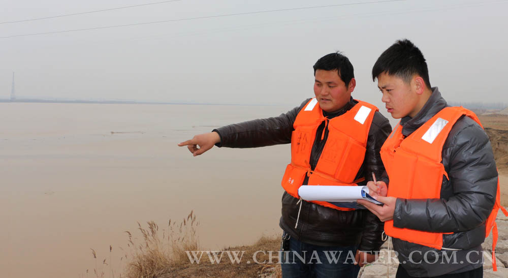 2月19日大年初一,山東東明黃河河務(wù)局高村管理段16號(hào)險(xiǎn)工,職工魏治華和宋思源正在觀測(cè)河勢(shì)凌情并做著記錄。(作者:李永波)