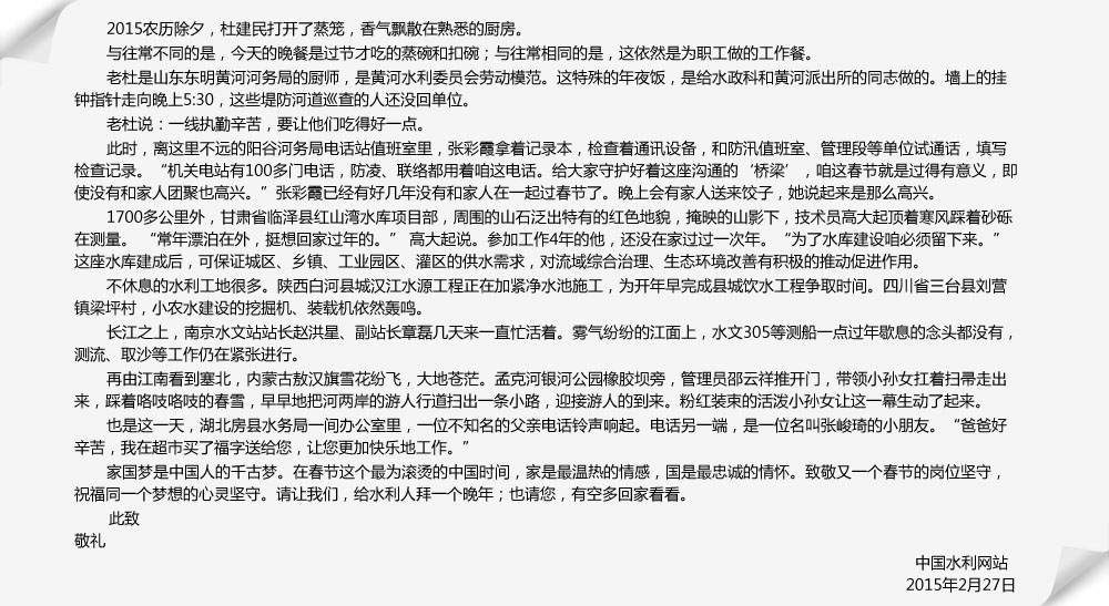 56歲的杜建民是山東東明黃河河務(wù)局的一名廚師,曾獲得黃委會(huì)“勞動(dòng)模范”的稱號(hào)。今年除夕夜,老杜的廚房香味四溢,蒸碗、扣碗誘人無(wú)比。這頓年夜飯是給水政科的和黃河派出所做的,他們?nèi)サ谭馈⒑拥肋M(jìn)行巡查了。談起辛苦,老杜說(shuō):“我不辛苦,辛苦的是他們,你看都快5點(diǎn)半了,還沒(méi)回來(lái)。咱們一定要做到保障有力,讓他們吃的更好一點(diǎn),才對(duì)得住一線執(zhí)勤的職工?!保ㄗ髡撸豪钣啦ǎ?/p>
