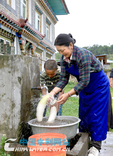米林縣八口之家女主人白瑪在用清潔自來水洗菜 繆宜江攝