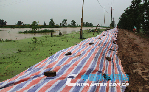 在小圩堤四閘,記者見到青泥湖辦事處辦公室主任周少龍,一臉的倦容,頭發(fā)早已被雨水打濕,他正在查看水位情況。這里湖面開闊,水面上籠罩著一層薄霧,暴漲的水位已經(jīng)把水位尺完全淹沒,“這里的水位尺最高的刻度是16.50米,現(xiàn)在已經(jīng)在水面下了!敝苤魅紊嫠畯澭鼘⑹直凵爝M(jìn)湖水里,通過他的手,記者才依稀看到水位尺頂端的印記。周主任又帶記者來到朱圩電排站,門口整理碼放著彩條布、編織袋等備汛物料。電排站附近的水位差不多與河堤齊平,“青泥湖辦事處小圩堤長(zhǎng)度有6700余米,這里的堤身都比較低,堤頂高程平均不足16.50米,東西兩側(cè)最低處的都不足16米,F(xiàn)在水位16.72米,可以說很多地方水位都已經(jīng)高過堤壩的頂端了,而且大部分田地的地勢(shì)都比堤壩低了很多,一旦洪水漫灌進(jìn)來,就會(huì)造成損失。所以我們對(duì)一些河道加固子堤,防止洪水漫堤!表樦苤魅问种傅姆较蛲ィd延三公里的堤壩鄰水側(cè)已經(jīng)壘起一條高度二十厘米左右的土方,都用彩條布覆蓋裹好,并用石塊壓住使其固定。除了洪水漫堤,小圩堤西側(cè)還有2300米嚴(yán)重脫坡的險(xiǎn)情,青泥湖辦事處也是及時(shí)發(fā)現(xiàn)險(xiǎn)情并快速搶險(xiǎn),龍感湖管理區(qū)還調(diào)派塞湖辦事處的防汛搶險(xiǎn)力量前來支援。