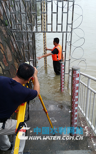 身邊的水尺桿只露出了3根,而其他的12根全都淹沒在不斷上漲的洪水里,林紅武的半個身子泡在水里,和他的搭檔游佳祥一遍又一遍地核對著水尺的零點高程,生怕出半點差錯。隨著湖南省和岳陽市分別啟動防汛Ⅱ級響應,他們的工作強度明顯增強。