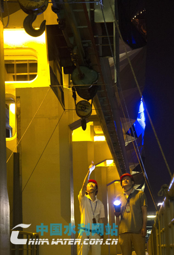 21時(shí)45分,迮振榮和秦惠忠在工程檢修橋上查看主體工程混凝土及移動(dòng)啟閉機(jī)情況。本站記者 繆宜江/攝