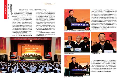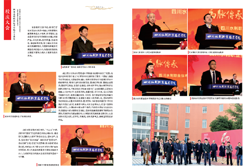 2016年11月,四川水利職業(yè)技術(shù)學(xué)院隆重慶祝了建校60周年,水利部原黨組副書記、副部長(zhǎng)、水利部參事咨詢委員會(huì)主任矯勇,四川省委常委、省委秘書長(zhǎng)、副省長(zhǎng)王銘暉,水利部原黨組成員周保志,以及水利部人事司原副司長(zhǎng)孫高振,四川省委教育工委書記、教育廳廳長(zhǎng)朱世宏,省水利廳黨組書記、廳長(zhǎng)胡云,成都市市委常委、常務(wù)副市長(zhǎng)謝瑞武等領(lǐng)導(dǎo)蒞臨學(xué)院視察指導(dǎo),3000多名校友、200余家兄弟單位、兄弟院校和社會(huì)各界到校祝賀,對(duì)學(xué)院60年辦學(xué)成就充分肯定,對(duì)學(xué)院未來發(fā)展寄予厚望。